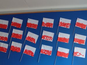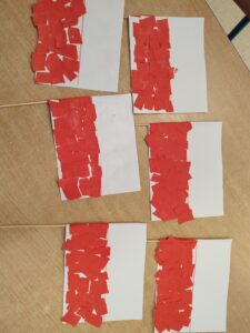 - Wykonały flagę Polski za pomocą wyklejanki oraz wysłuchały wiersza “Barwy ojczyste” Cz. Janczarskiego;