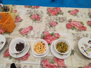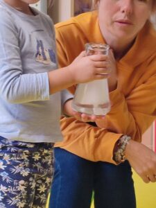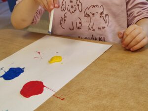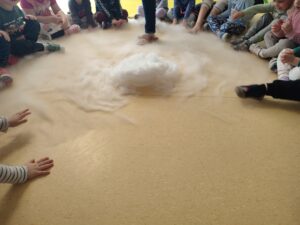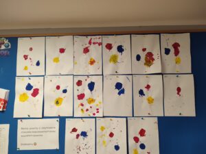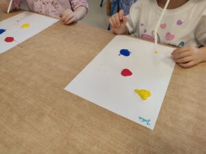 - Ćwiczyły swoje zmysły: rozpoznawały różne zapachy, rozdmuchiwały farbę za pomocą słomek, próbowały różnych smakołyków, słuchały dźwięków z otoczenia;