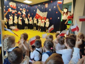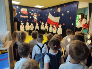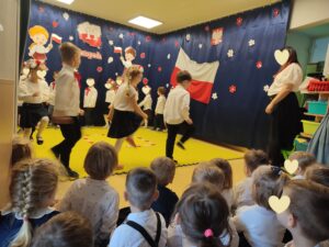 - Celebrowały Dzień Niepodległości – uczestniczyły w przedstawieniu przygotowanym przez grupę starszaków i wspólnie odśpiewały „Mazurek Dąbrowskiego” (akcja “Szkoła do hymnu”);