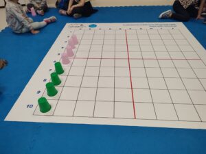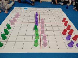 - Bawiły się z kodowaniem: przeliczały kubeczki i oczka na kostce, ustawiały kubeczki w odpowiednich miejscach na macie do kodowania;