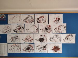 - Wykonały sylwetę jeża metodą stemplowania z użyciem farby i widelca;