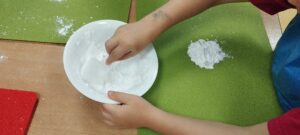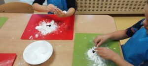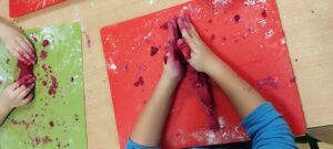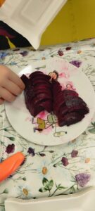 • W tym miesiącu dokonaliśmy nasze zmysły w ramach projektu „Kraina Zmysłów”. Pomagały nam w tym buraki – wąchaliśmy je, próbowaliśmy, porównywaliśmy, smakowaliśmy różnych buraczanych rzeczy i przygotowaliśmy burakolinę (masę plastyczną). Byliśmy „nieco” brudni, ale za to szczęśliwi!